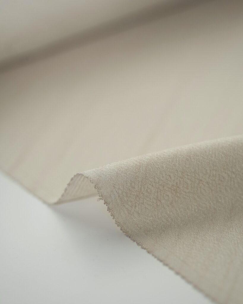 極小の菱が浮かぶ地紋に、精緻な「しけ引き」の線が重なり、無地を越えた奥行きを生み出す。職人が刷毛一本で染め上げる数色の重なりは、影をふわりと落とすよう。